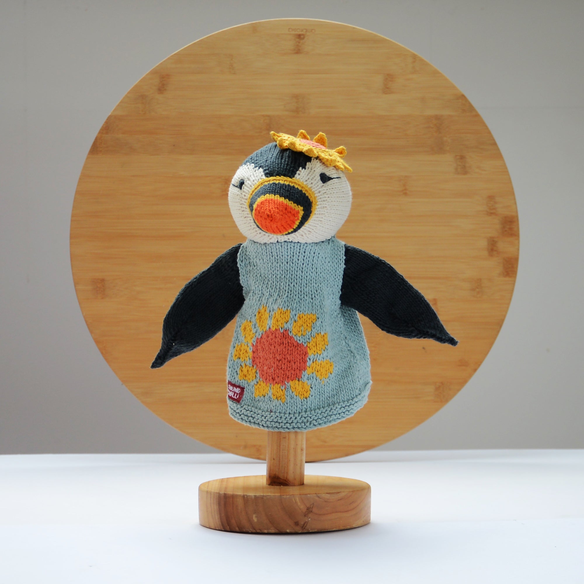 This lovely puffin is beautifully hand-knitted in organic cotton. It measures roughly 24cm/9 inches tall.