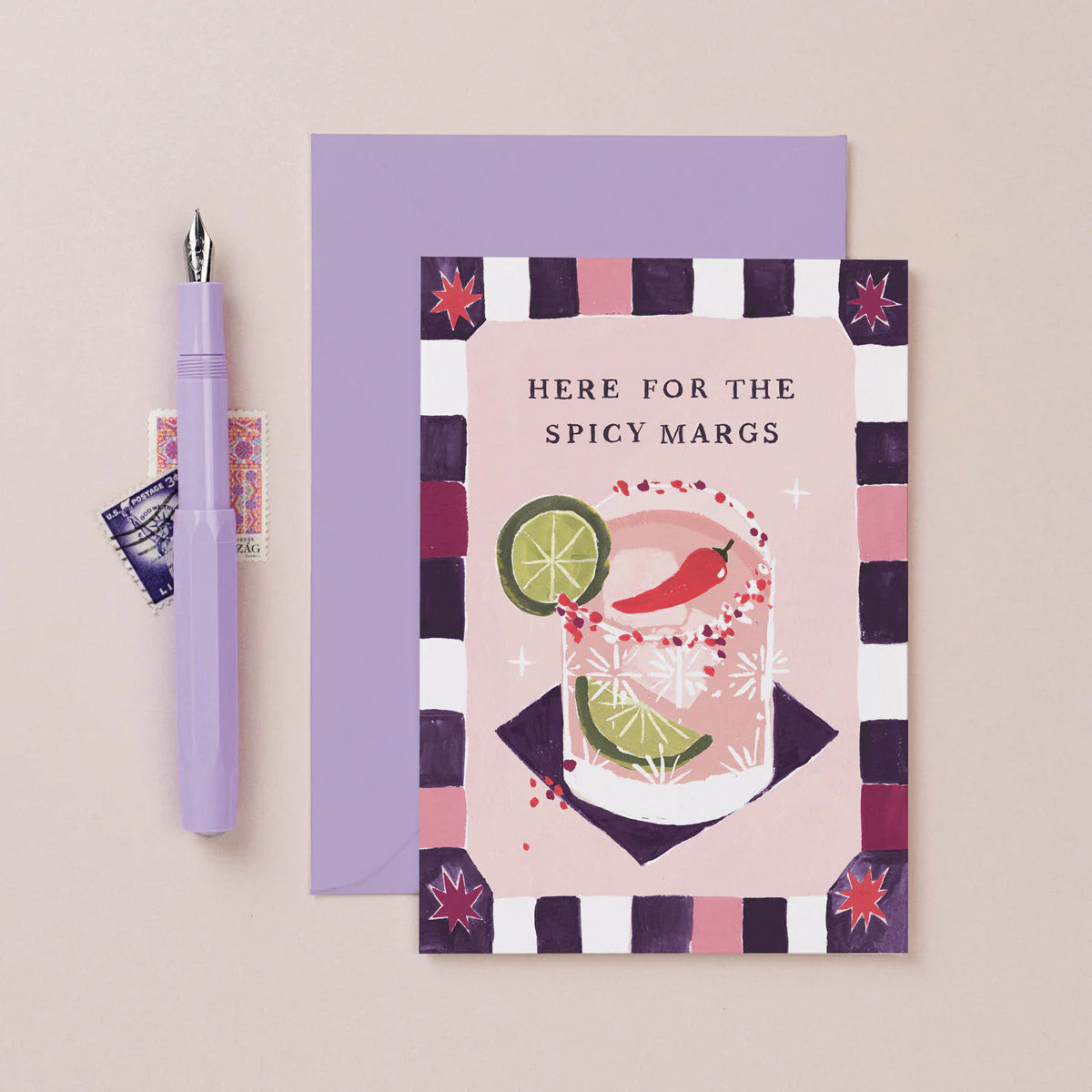 The fresh, fruity and fiery combination of flavours from a spicy margarita makes them hard to beat, inspiring the stunning artwork on this cocktail birthday card. The hand-lettered caption on the birthday card reads, "Here for the spicy margs", identifying the best part of any celebration. Complete with chili, limes and tajin rim, the artwork on the margarita birthday card looks good enough to drink. Surrounded by a bold colour-block border in sunset-inspired hues, the colourful birthday card provides the delicious dopamine to kick off any party. Add a handwritten message to the blank inside for the finishing touch.