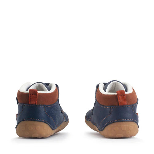 The Pip pre-walking bootie is designed for ease and comfort. Featuring a double rip-tape fastening and a choice of three width fittings, Pip allows for quick, secure closure and offers a precise, adjustable fit, making it easy to get these on and off little feet. The classic combination of navy leather with a tan collar strikes the perfect balance between timeless and modern style. Ideal for the cooler months from autumn through spring, these booties are crafted with comfy insoles that provide all-day comfort, ensuring little feet are supported as they explore. The thoughtful design blends style, comfort, and practicality, making our Pip bootie a go-to choice for little ones.