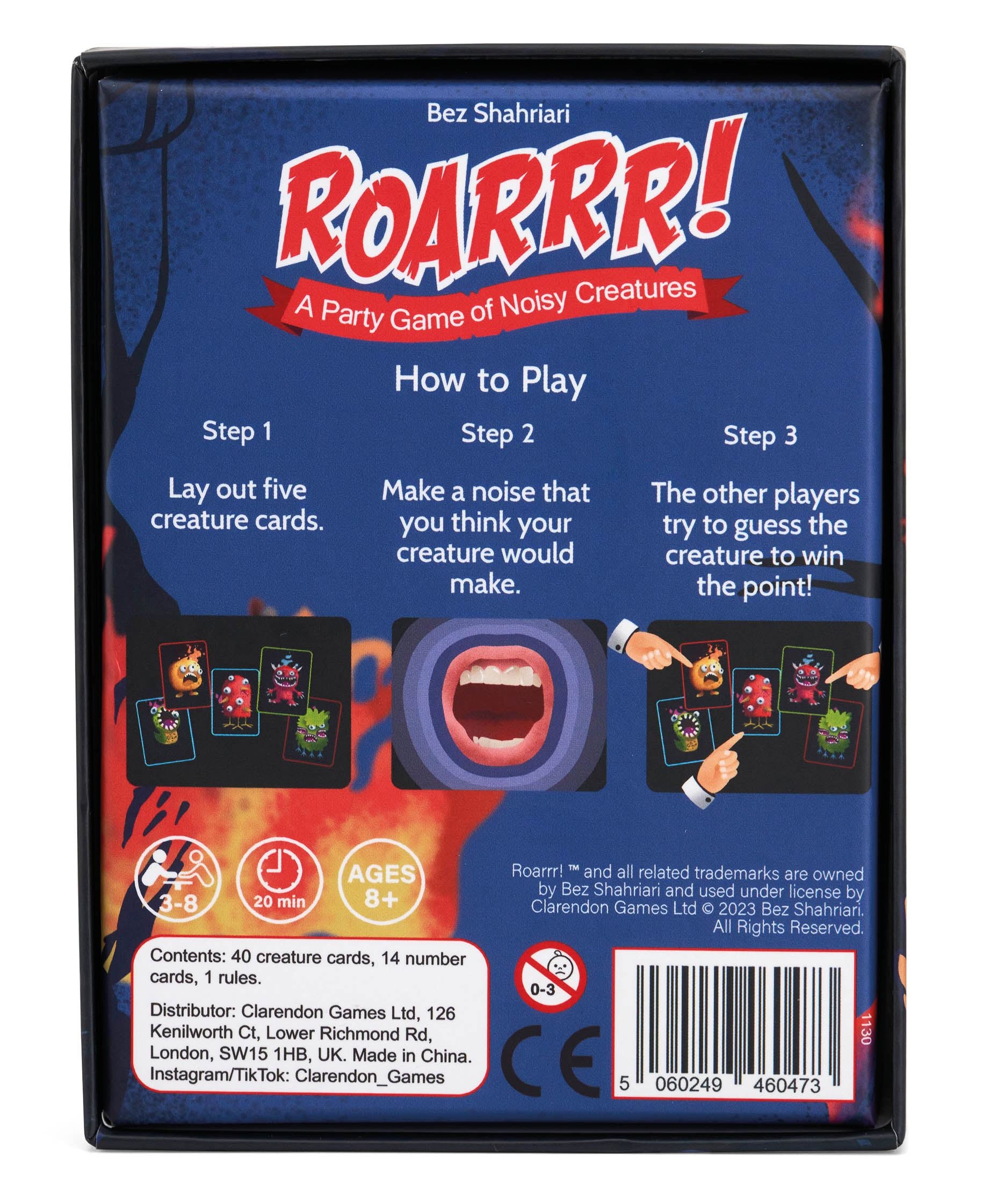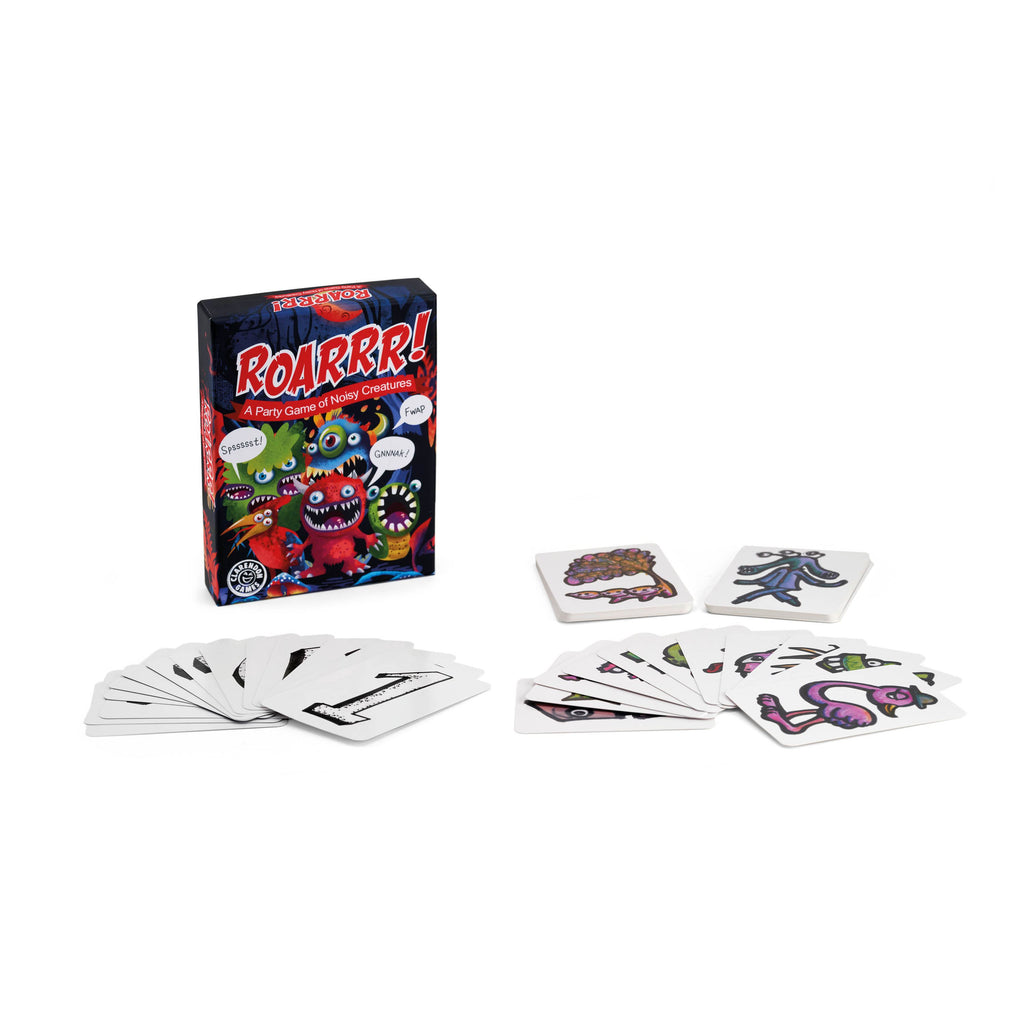 Roarrr! is a game about weird and wonderful creatures. One player determines the ‘target creature’ for the round, then makes the noises that they believe best fits that creature whilst other players close their eyes. The others must attempt to identify the target creature from a selection of 5 creature cards based only on the noises they hear. The player who made the noise gets a point if the majority guessed correctly, and everyone else gets a point for guessing correctly, or for guessing with the majority. Suitable for ages 8+