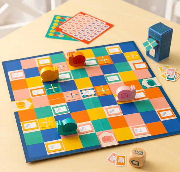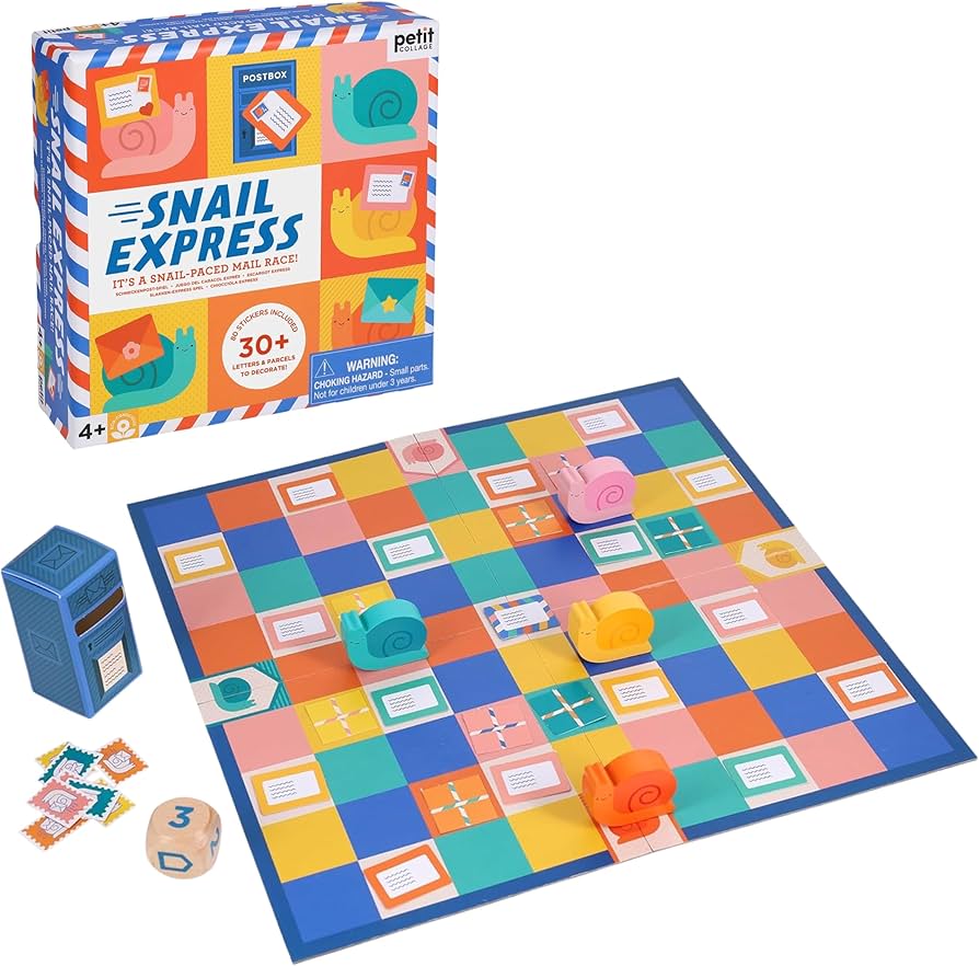 In this snail-paced mail race, players help their busy Snail Carriers collect and send letters and parcels as fast as they can. Roll the die and decide where to move. If you land on a letter or a parcel, pop it in the postbox. Or aim for an Express Delivery Stamp to zip your way straight to a letter! Be careful to avoid the other players’ mail, though, because if you post their parcel, they’ll get the points. And be sure to play nice because if anyone rolls the depot icon, they can send another player’s snail straight back to the start! When all the letters have been sent, the player with the most mail in the postbox is the winner.