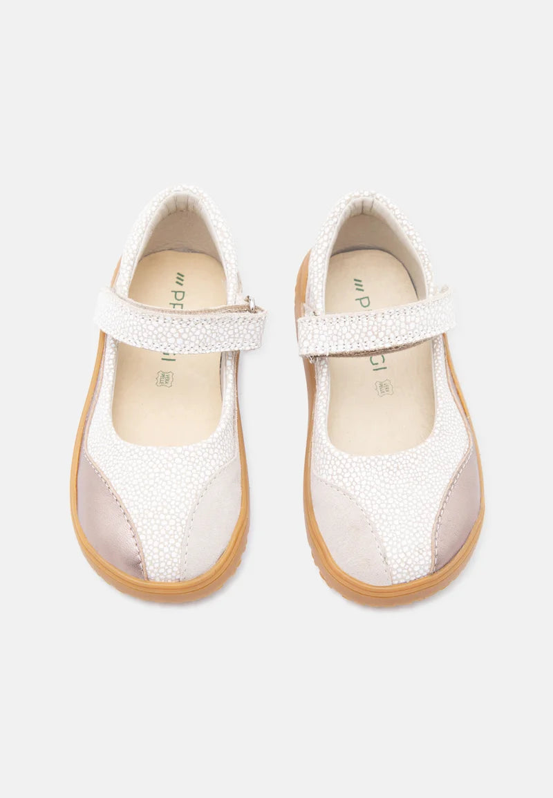 Introducing the Primigi Metallic Mary Jane in Barefoot style – a charming shoe designed for little feet. Crafted with a supple leather upper and microfiber lining, this shoe offers comfort and durability. The abrasion-proof rubber sole withstands everyday wear, whilst cold padding provides gentle cushioning. The synthetic insole supports natural foot development. Perfect for school or special occasions, this metallic Mary Jane combines classic style with practical barefoot design. Treat with a suitable protector before wear to maintain its finish.