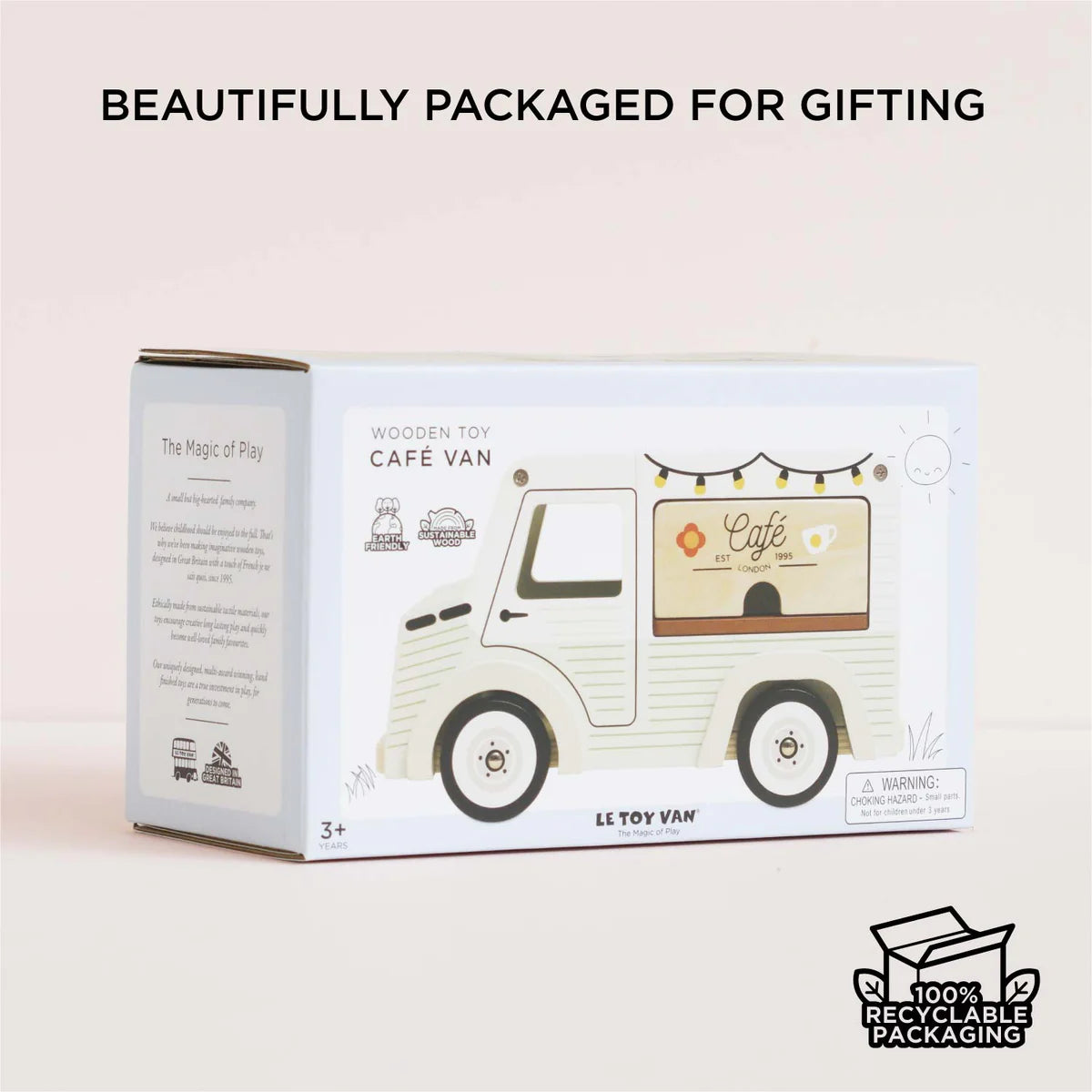 Crafted from certified wood, this vintage-style Café Van is painted in a delightful pistachio green and white and features intricate artwork on all sides. The flip-opening roof reveals a coffee and tea menu display board, while the front-opening service hatch allows little baristas to serve their customers with ease.
