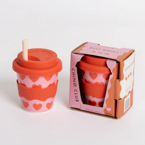 An on trend love heart print melamine babychino keep cup for the little softies. Melamine based cup with a silicone lid and complete in a cute gift box. Straws sold separately.