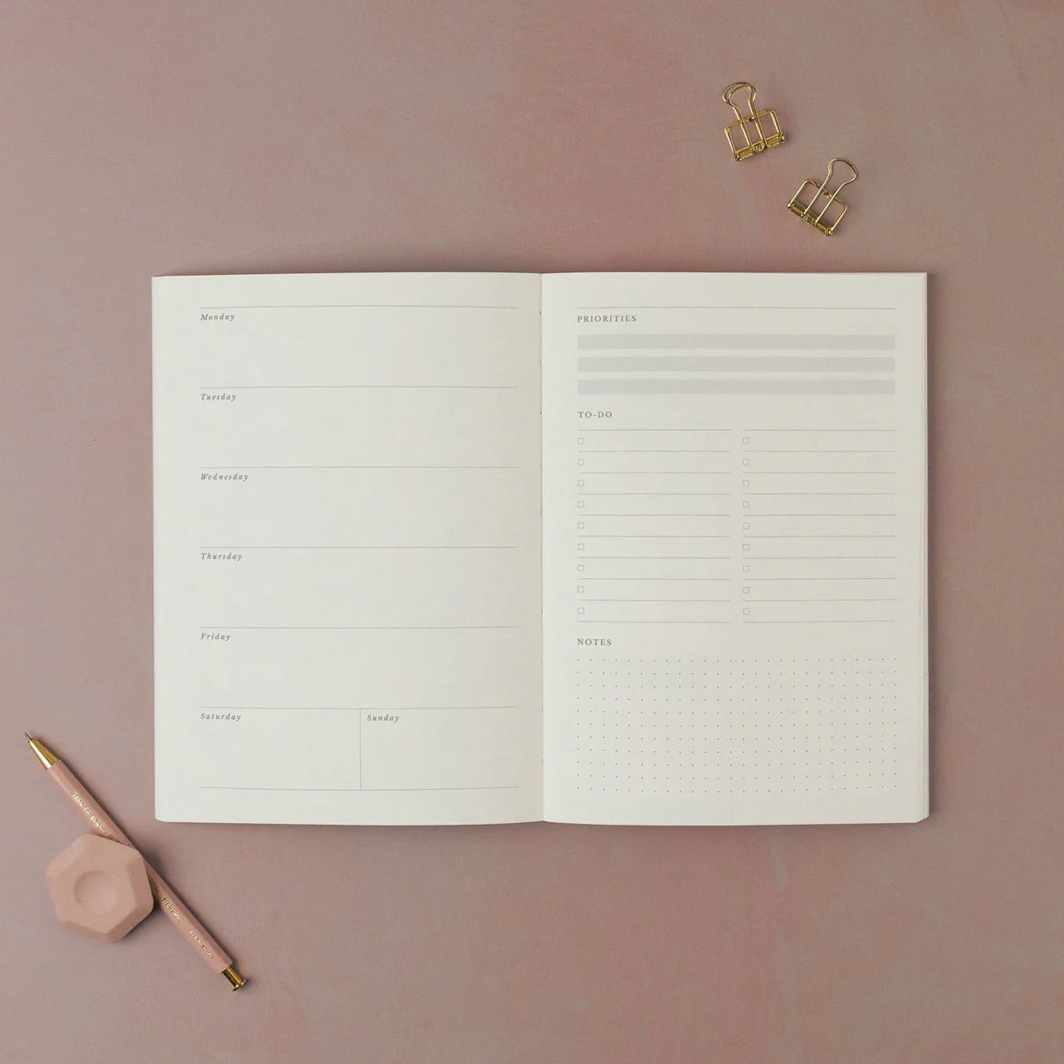 This weekly planner is designed to support mindful goal-setting while helping you stay organised and balanced. Inside, you’ll find space to define priorities, jot down checklists and plan your weeks in a way that reflects what truly matters to you.