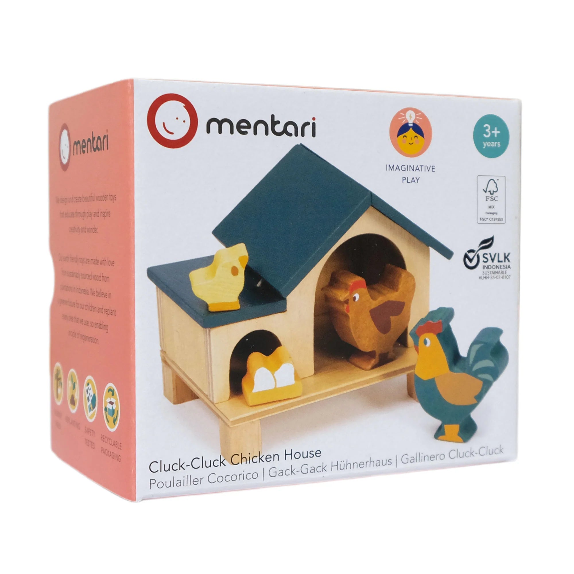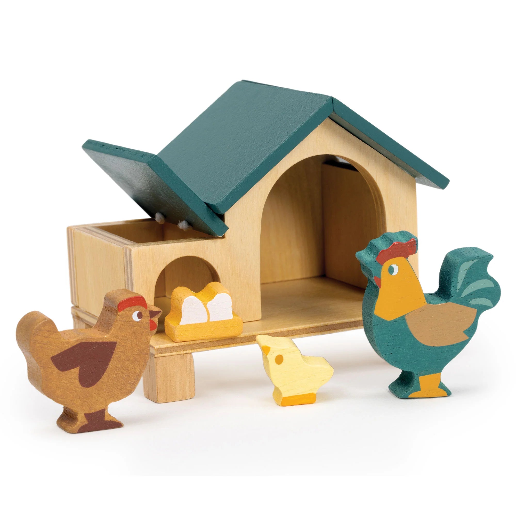 The sweetest little chicken coop, complete with cockerel, hen, chick and eggs. Put the chickens to sleep in the house and find the eggs by lifting the lid on the side.