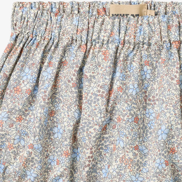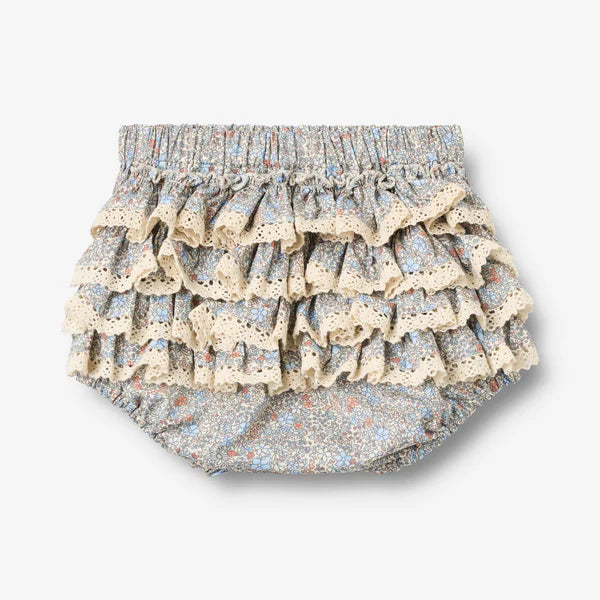 Printed nappy pants with large ruffles at back in soft woven organic cotton for babies.
