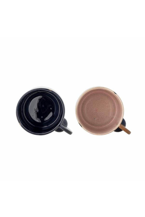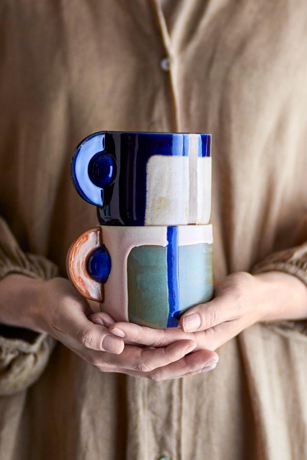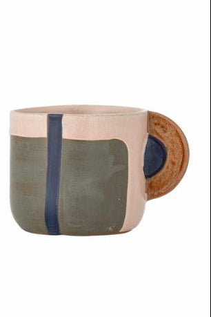 The Bolivia Cup by Bloomingville, featuring a reactive glaze and handpainted finish. The design combines bold navy blocks with soft beige and rose tones in a geometric pattern. Small variations in pattern and colour intensity may occur, making each piece unique.