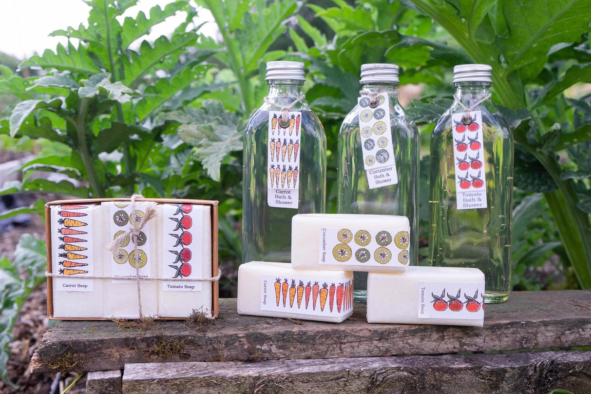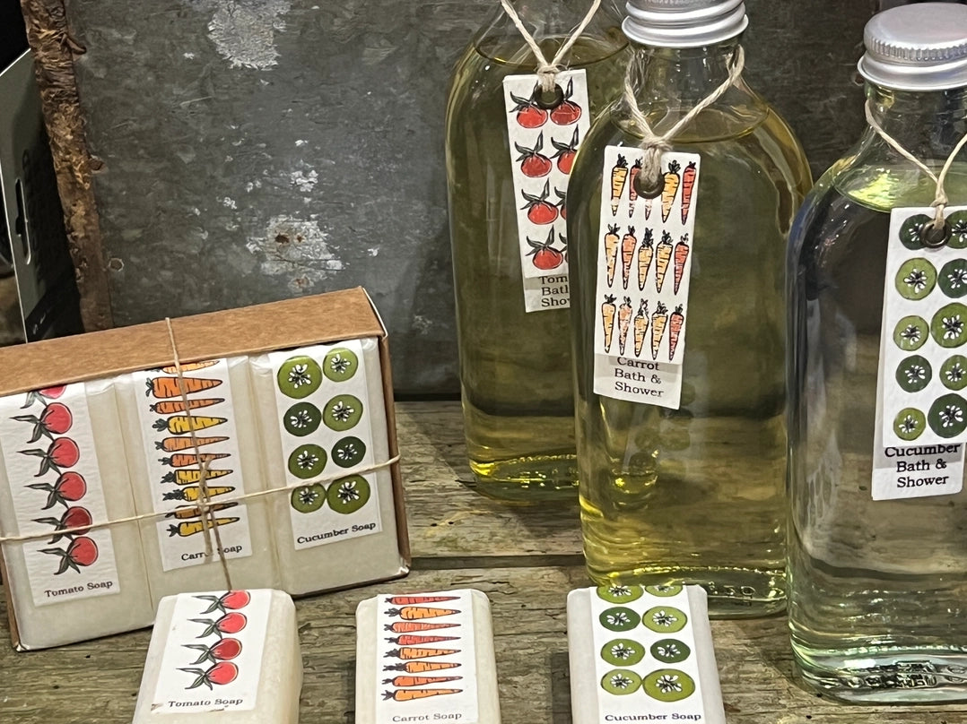 Wrapped 80g soaps assorted. These are triple milled, made without colour and fragrances. Tomato leaf, carrot and cucumber. Packaged in waxed paper with beautiful hand illustrated label. (4 of each fragrance).