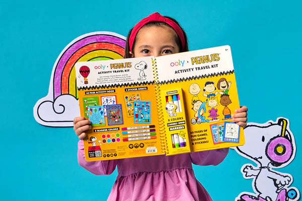Hours of fun can be had with the OOLY x Peanuts Activity Travel Kit featuring Snoopy, Charlie Brown, and the Peanuts gang! Packed with a 60-page activity book full of puzzles, games, and colouring sheets, this travel kit is perfect for kids who love the Peanuts gang’s adventures. The set includes 4 double-ended markers with 8 colours and 2 sheets of Peanuts-themed stickers. With these travel games for kids, you can help Linus find his blanket or colour Snoopy’s next big adventure. This activity kit is full of fun for kids and Peanuts fans of all ages.