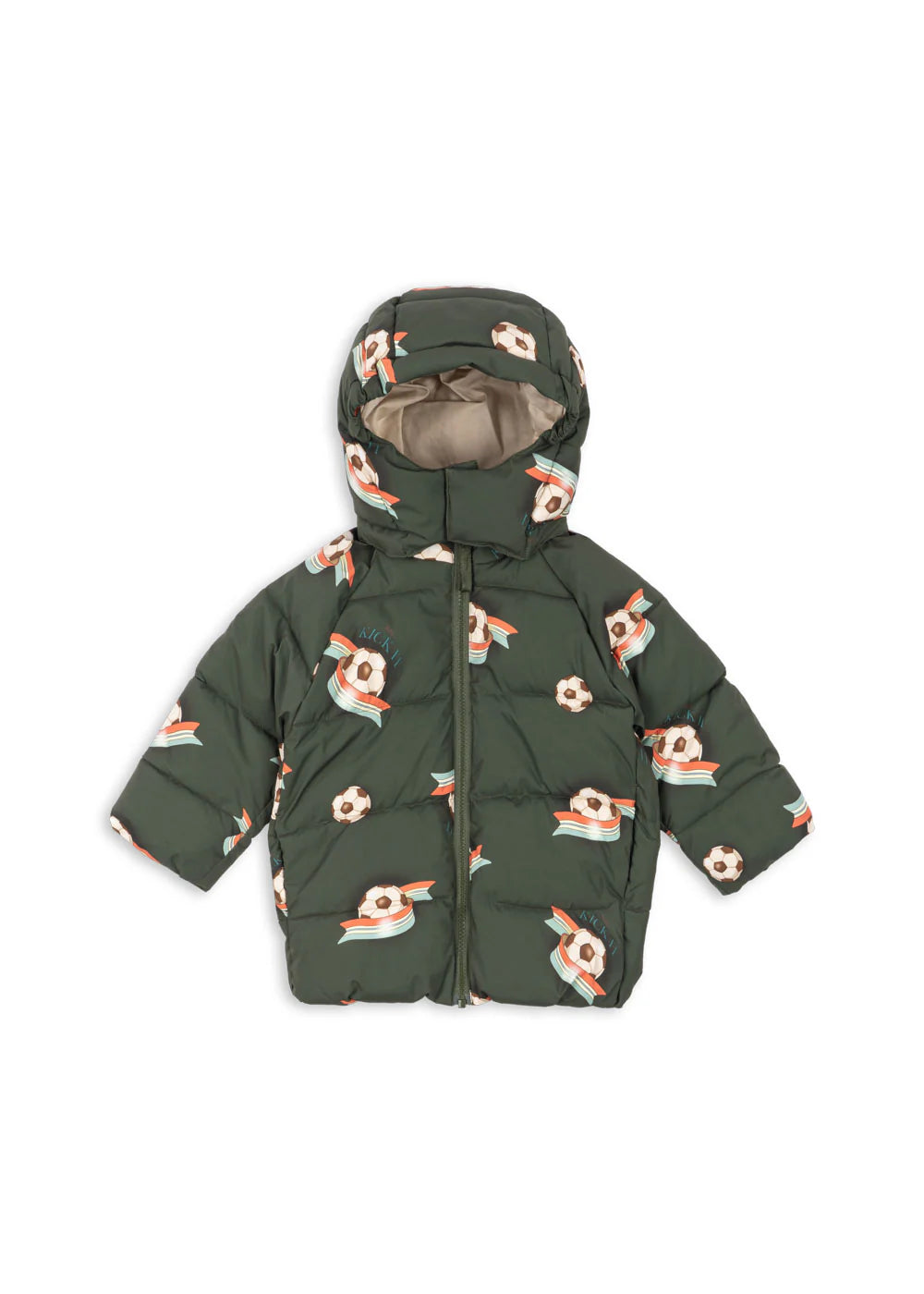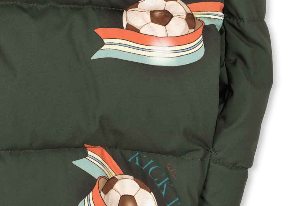 The Konges Sløjd Nuka Jacket – Green / Kick It is a warm and practical puffer jacket designed for ultimate weather protection while keeping little ones comfortable and stylish. Crafted with THERMOLITE® EcoMade padding, it provides lightweight insulation that locks in warmth without feeling heavy. The detachable hood, storm cuffs, and gentle water-repellent, wind-resistant finish ensure protection against the elements, while the breathable design (3000 g/m2/24h) prevents overheating during active play.
