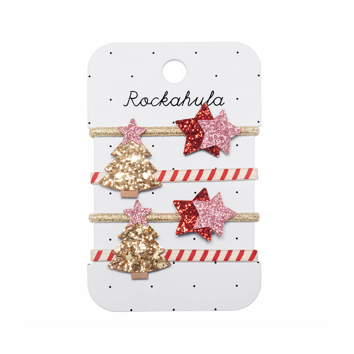 Add a dash of festive fun with the Stripy Christmas Tree Ponies from Rockahula. This cheerful set features four elastic hair ties with glittery green Christmas trees, candy cane stripes, and bright pops of red. Perfect for party season or everyday sparkle.