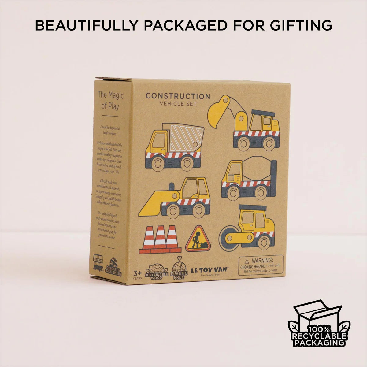 Budding builders are sure to love our best-selling construction set, a lovely plastic free toy for eco-friendly play. Take imaginations off to new adventures with this 9 piece toy which includes a digger, cement mixer, dump truck, roller, front loader, cones and road works sign.