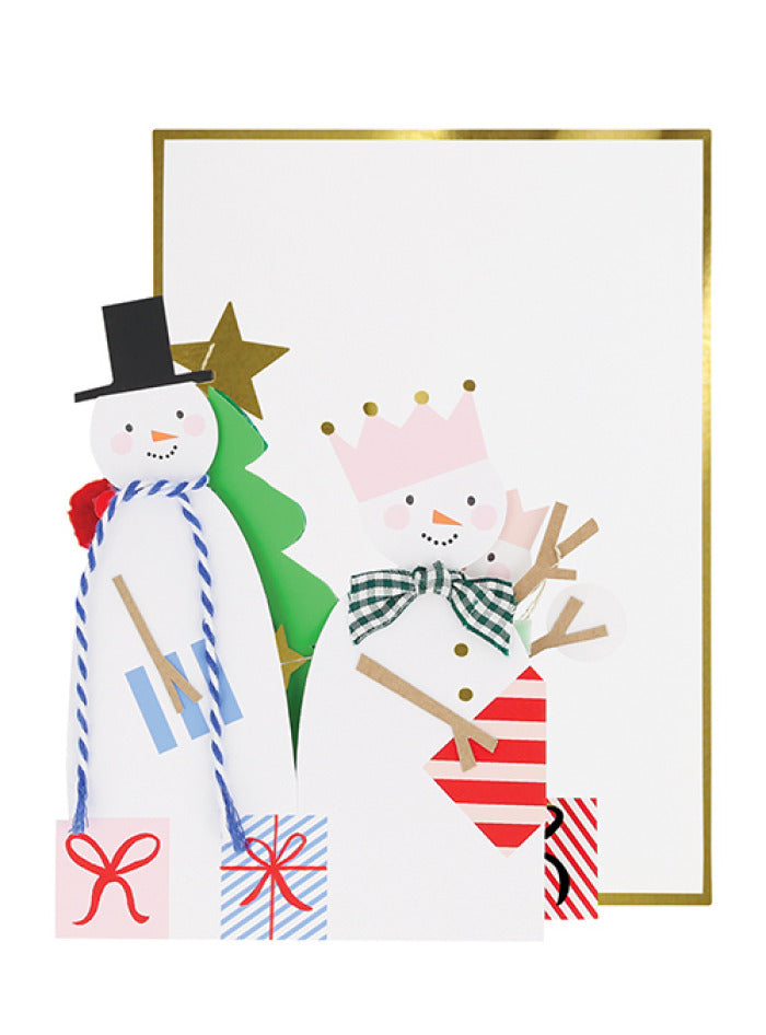 Each snowman has a delightful embellishment - a blue and white bakers twine scarf, a green and white gingham ribbon bow, a pink ribbon scarf, a red pompom or a light green velvet ribbon bow. The Christmas tree has a honeycomb detail for a 3D effect, and comes with a green paperclip to hold it open. The tree has a shiny gold foil star on top for a stylish effect