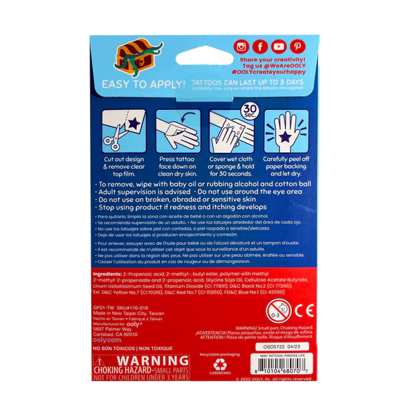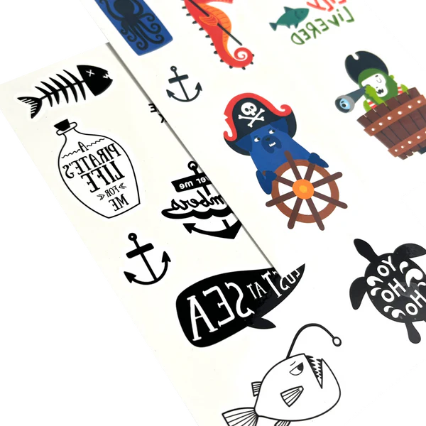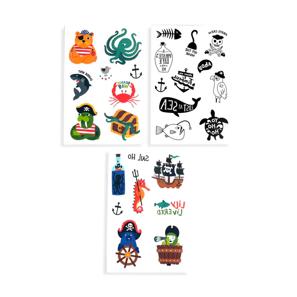 If you’re looking to put a smile on your kiddo’s face on a blimey, land-locked afternoon, these temporary tattoos are something they’re sure to be liking. Three tattoo sheets are included in this pirate themed set! Little matey’s will be cheering that they’re just arrr-mazing! What’s even better than pirate treasure? Pirate temporary tattoos! Designs are fiercely silly and include boisterous buccaneers like the wily walrus, the marauding monkey, and the booty-loving bear. These long lasting and durable temporary tattoos are a real treasure and sure to be loved by your little matey. They also make pARRRfect party favors for your kiddo’s next birthday party!