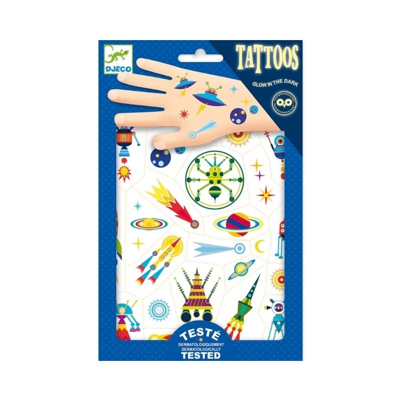 Djeco: Body Art Tattoos - Space Oddity. Two sheets of space-themed temporary tattoos. Children will especially love the glowing surprises and extra details that appear in the dark! These temporary tattoos are pre-cut to make them easy to use, and transfer using a little water. Dermatologically tested.