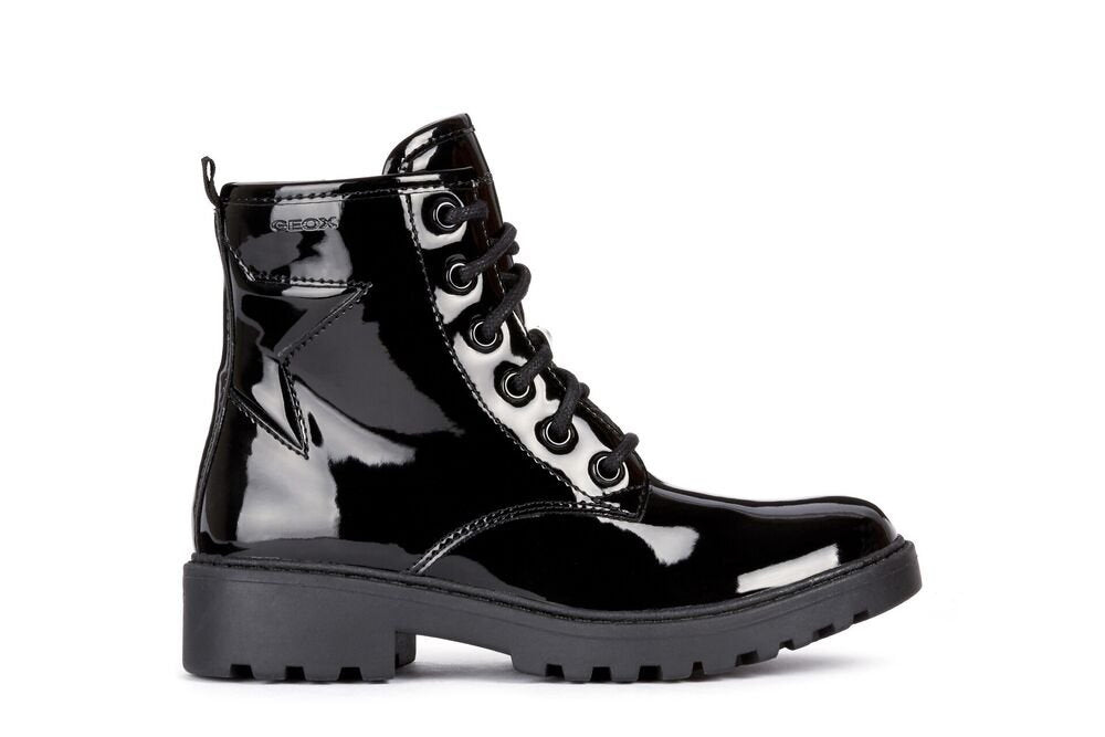 Step into school days and special occasions with style in the Geox Casey Star School Boots in glossy black patent. Designed for girls who love a touch of sparkle and comfort, these ankle boots combine on-trend fashion appeal with practical features. Easy to get on and off thanks to a lace-up and side zip fastening, they feature a removable antibacterial insole lined with non-toxic, chrome-free leather—perfect for healthy, happy feet.