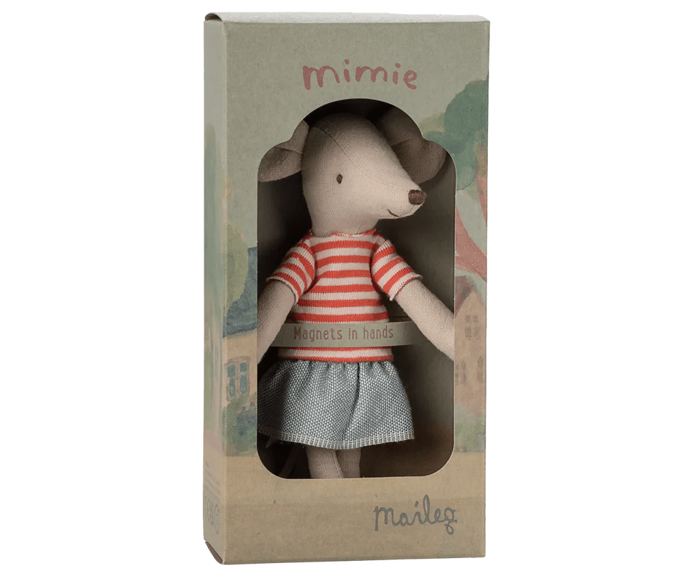 Meet Maileg’s Big Sister Mouse, the sweet and stylish sibling of LouiMax! Dressed in a charming red-striped t-shirt and a denim skirt, she’s always ready for fun and adventure. With hidden magnets in her hands, she can easily hold onto accessories for even more imaginative play.