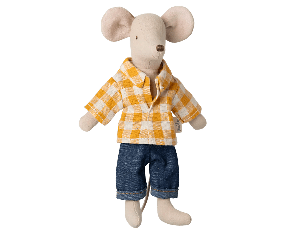 Meet Maileg’s Dad Mouse, a classic character dressed in a stylish checked shirt and denim pants. Always ready for adventure or a cozy night at home, he fits perfectly with Maileg furniture and accessories in mouse size.