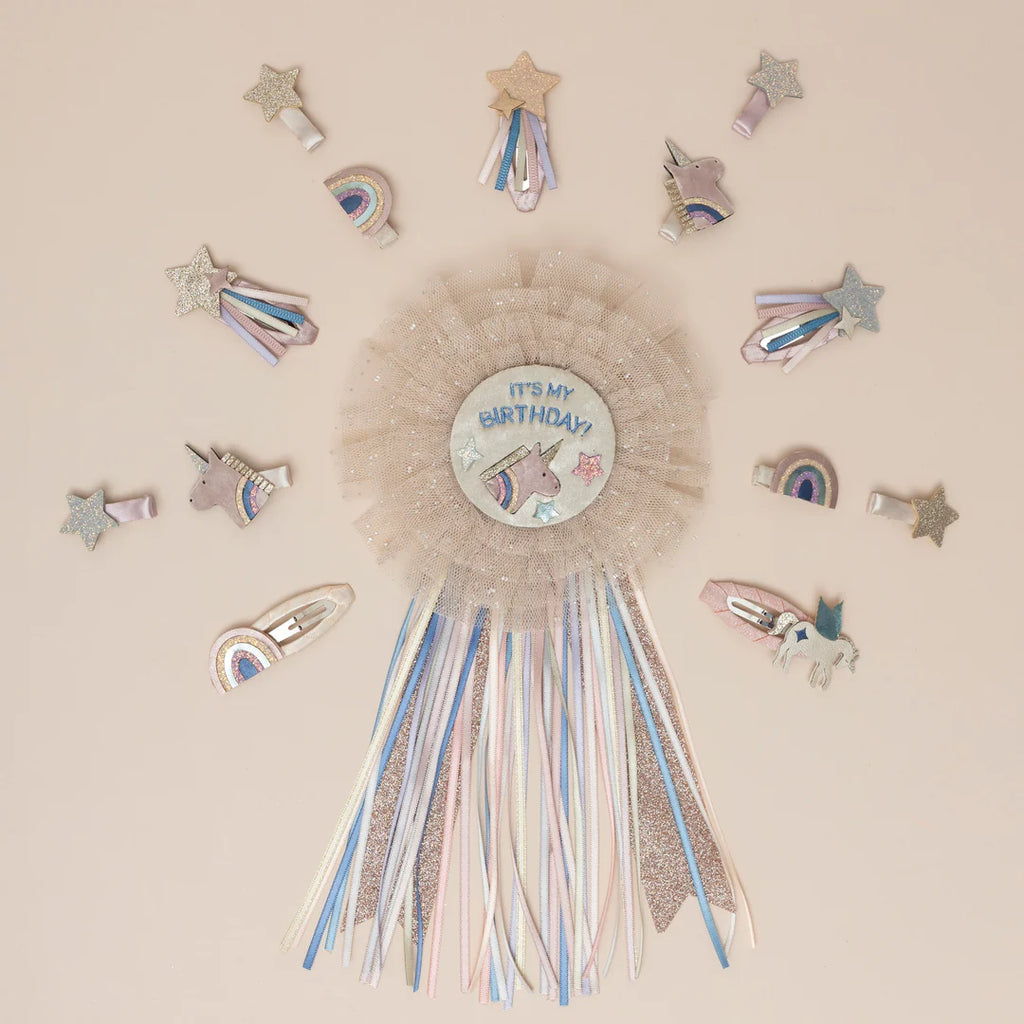 Help them celebrate in style year after year with our magical new unicorn birthday badge! Featuring layers of soft, glitter-speckled tulle and a colourful trail of ribbons, it’s the perfect sparkly touch for any birthday star!