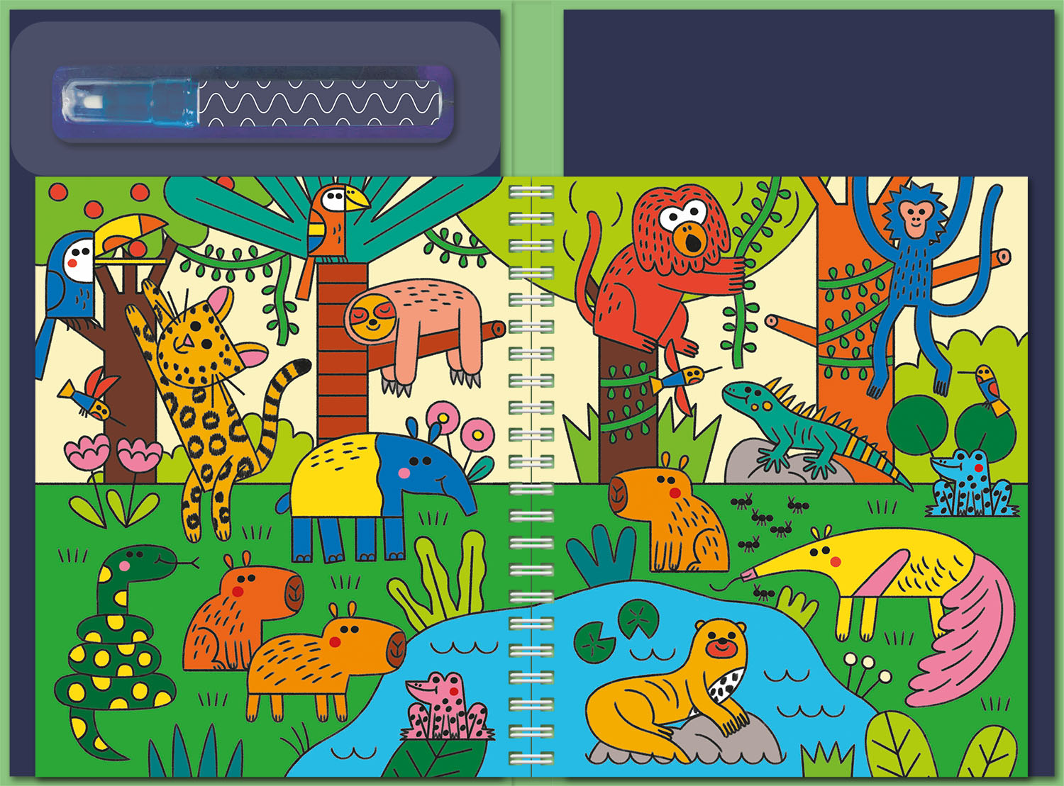 - Use the water marker pen to paint six special scenes of forests with water to reveal hidden colour.