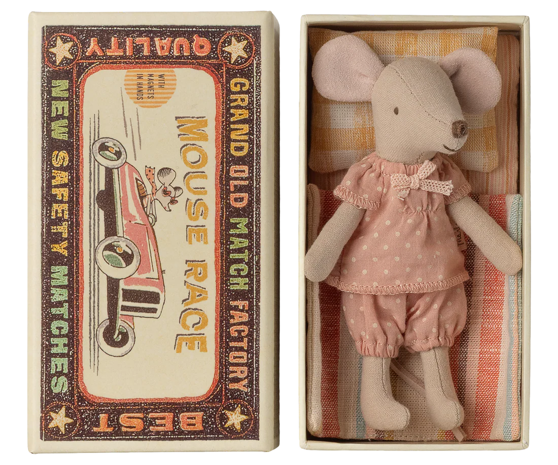 A classic Maileg item, this mouse is ready for hours of play and sleeps soundly in its little matchbox. The clothes and bedding are made of soft fabrics with unique prints in beautiful colors. The mouse has magnets in its hands. Fabric may vary.
