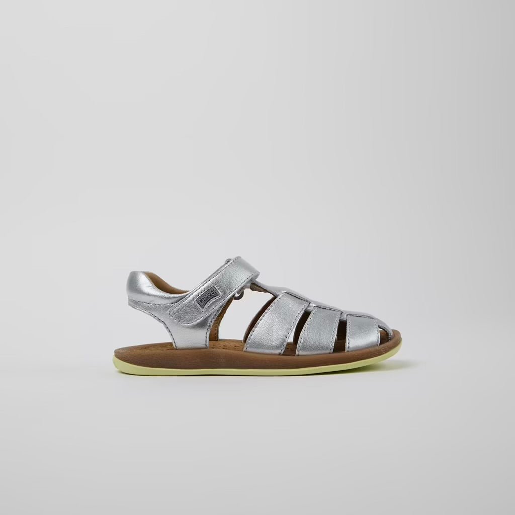 Silver leather kids' closed sandal with hook & loop system and rubber outsoles (20% recycled).