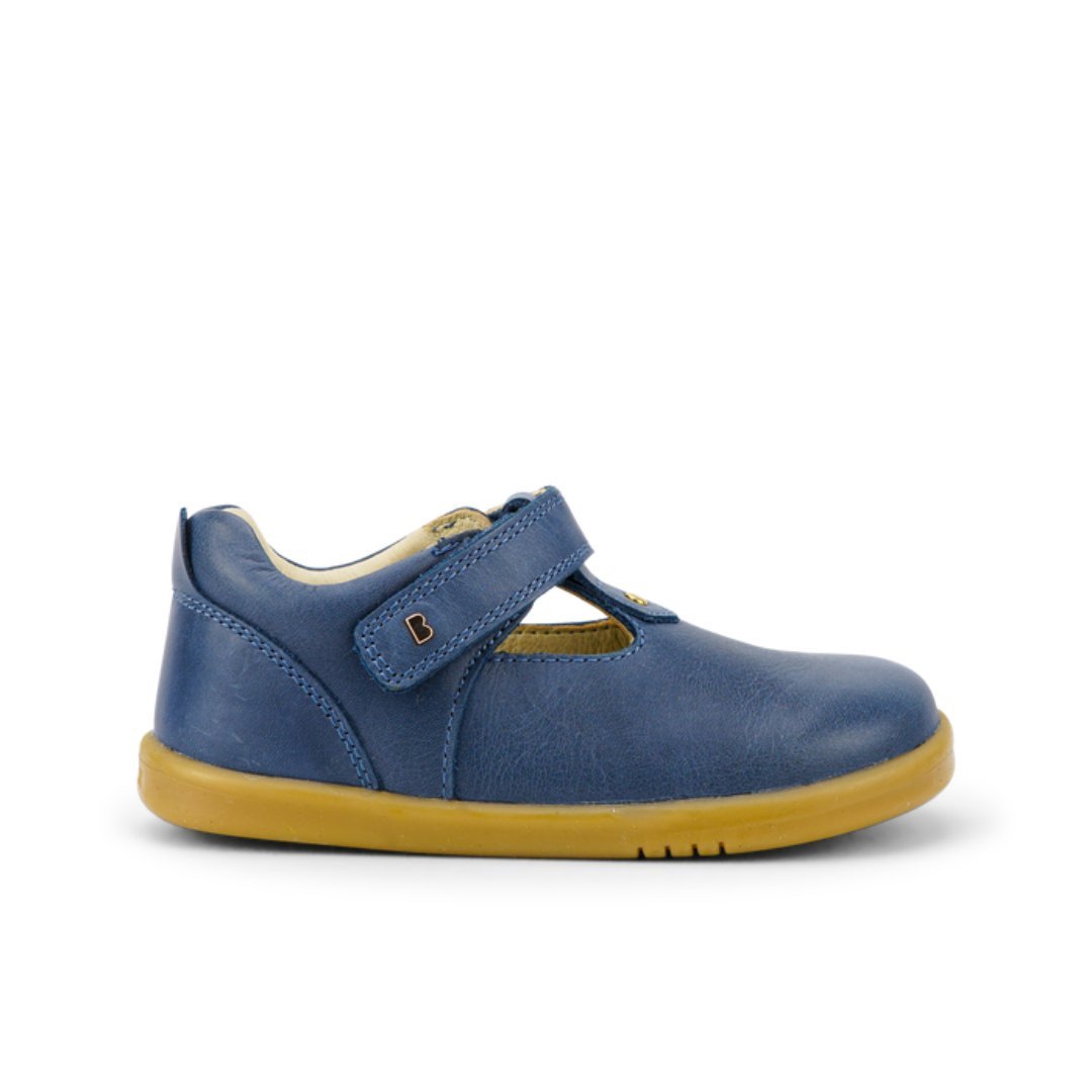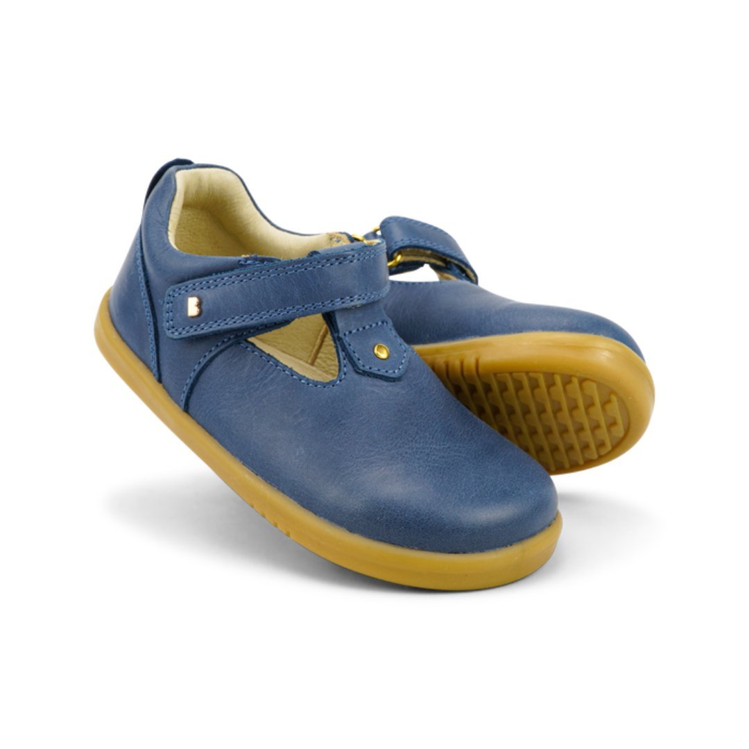Bobux: I-Walk Louise T-Bar Shoes - Midnight. A gold stud and stitch detail on the top of the T-bar style add elegance to a classic shape. The Louise shoe’s strap fastening provides an easy fit, and heel tabs add functionality when pulling these shoes on.