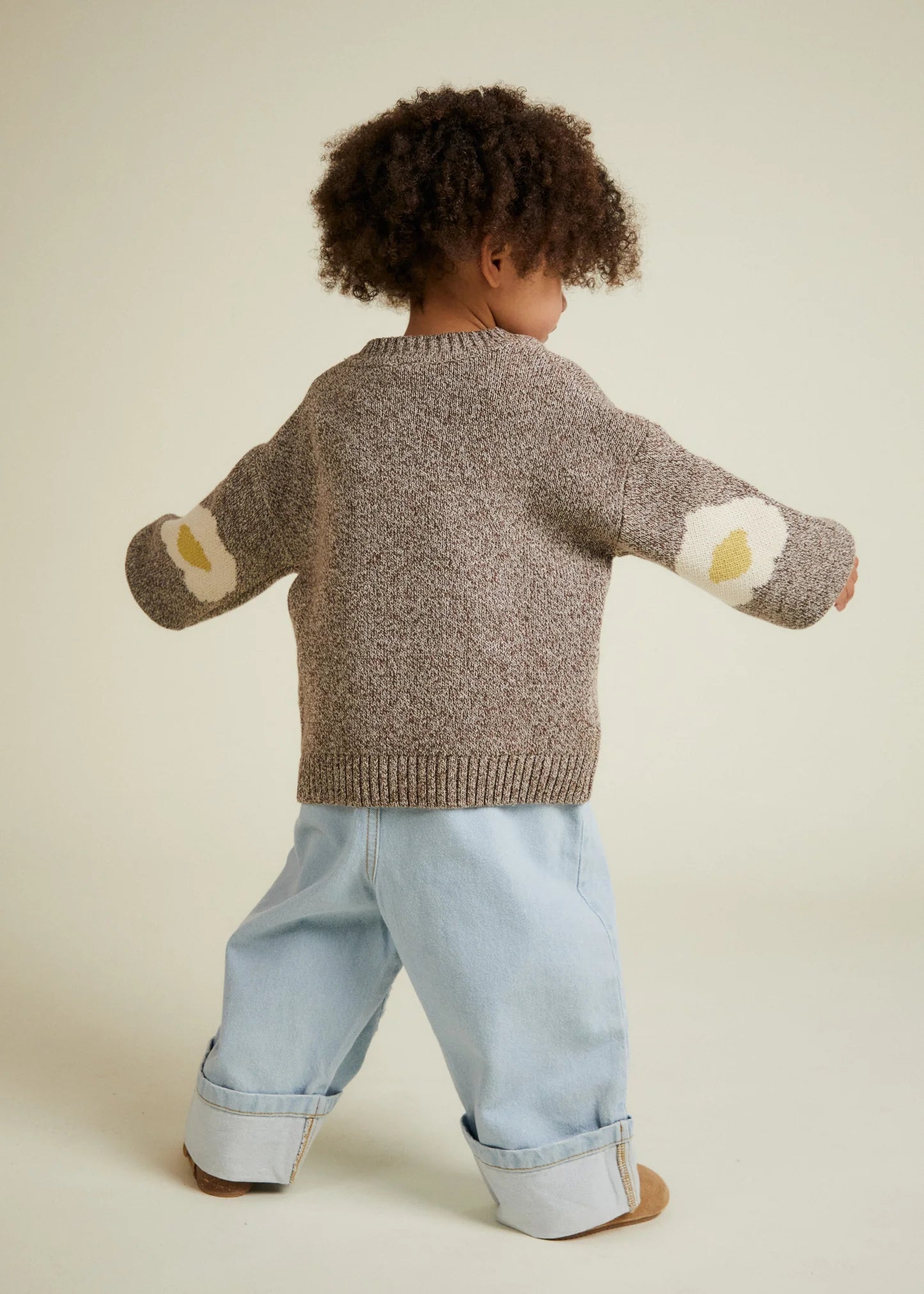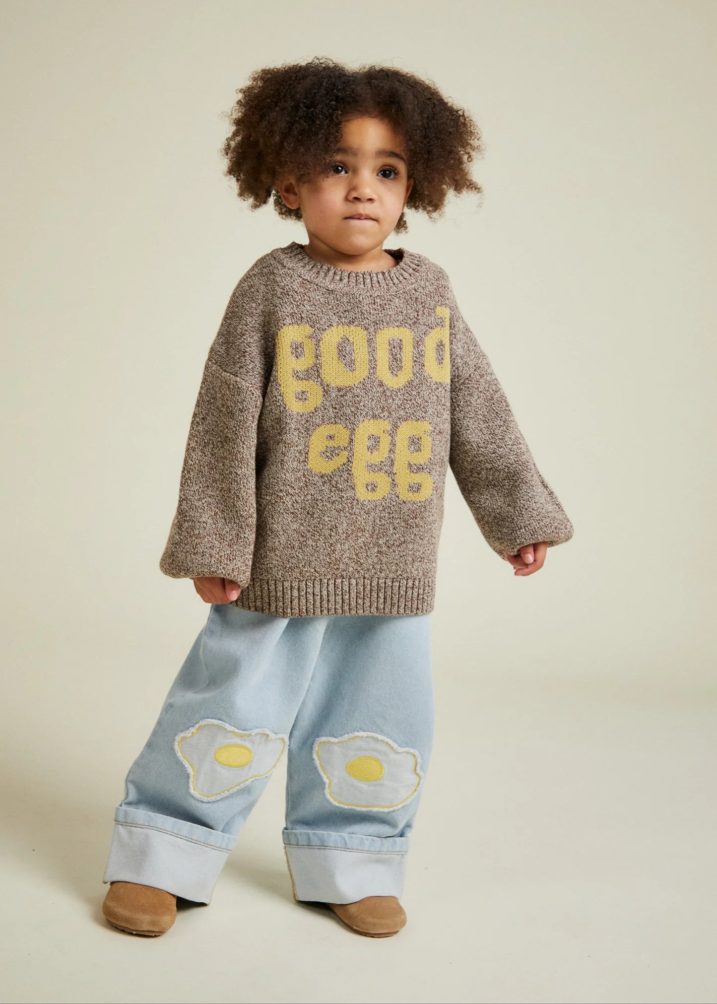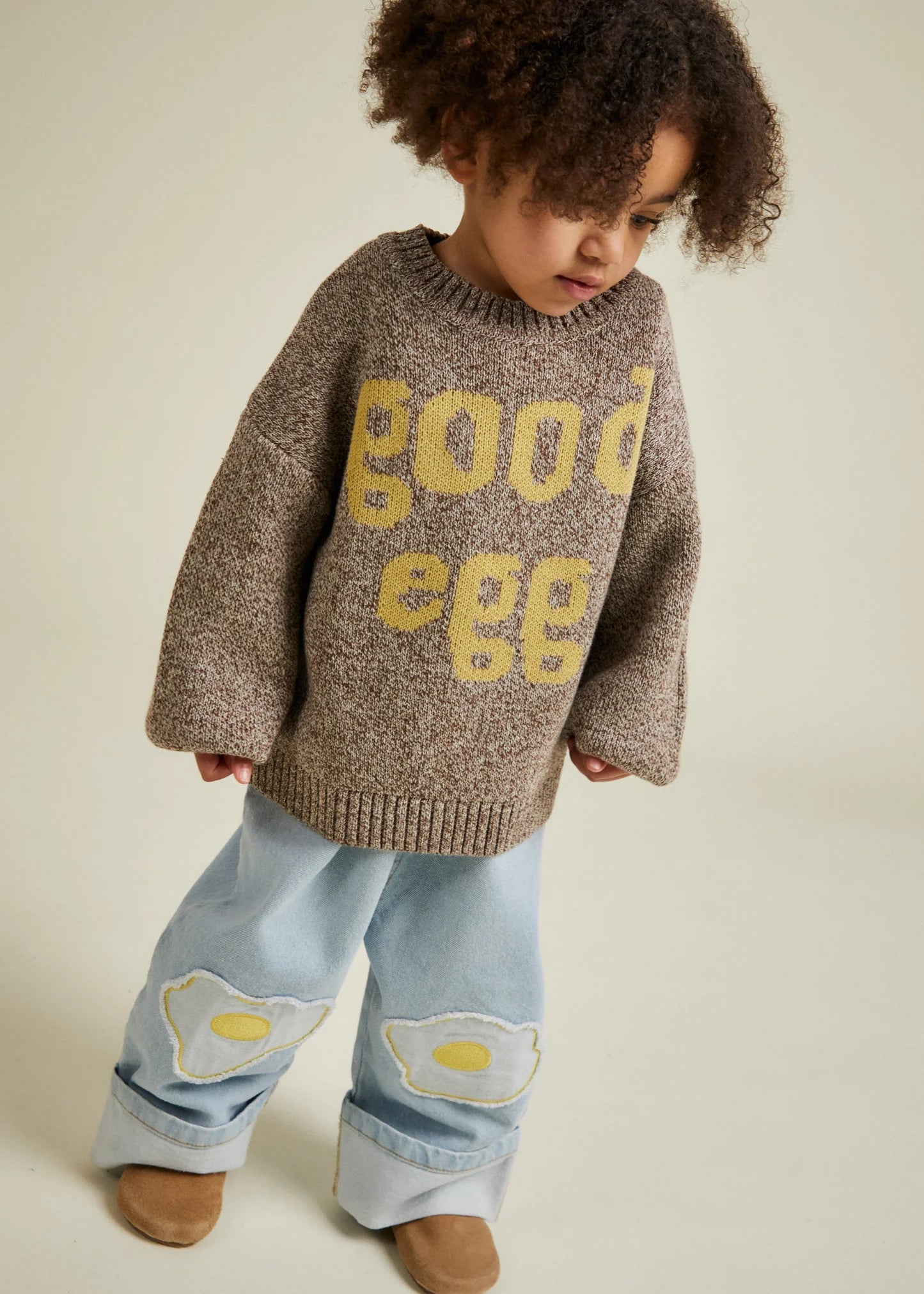 The Greta Good Egg sweater. Crafted from 100% organic cotton using our signature twisted yarn technique. Cut with an oversized, slouchy silhouette. Featuring balloon-shaped cuff sleeves with dropped shoulders and ribbed detailing to the hem, wrists and neckline. Finished with “Good Egg” print in a contrast yolk yarn and knitted egg patches on the sleeves.