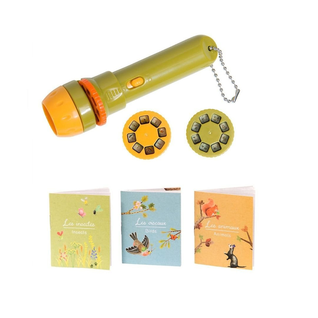 Moulin Roty: Storybook Torch - Le Jardin du Moulin. Discover an original way to tell stories to your little one with this storybook torch Le Jardin du Moulin ; three stories about nature: "Birds build their nest", "The caterpillar story" and "The 4 seasons". Easy to use: insert a disc into the lamp, switch on the lamp and project the images onto a wall or ceiling. With your finger, turn the disc to make the images appear one by one while telling your child the story. As your toddler grows, he/she will be able to tell the story while stimulating his/her imagination.