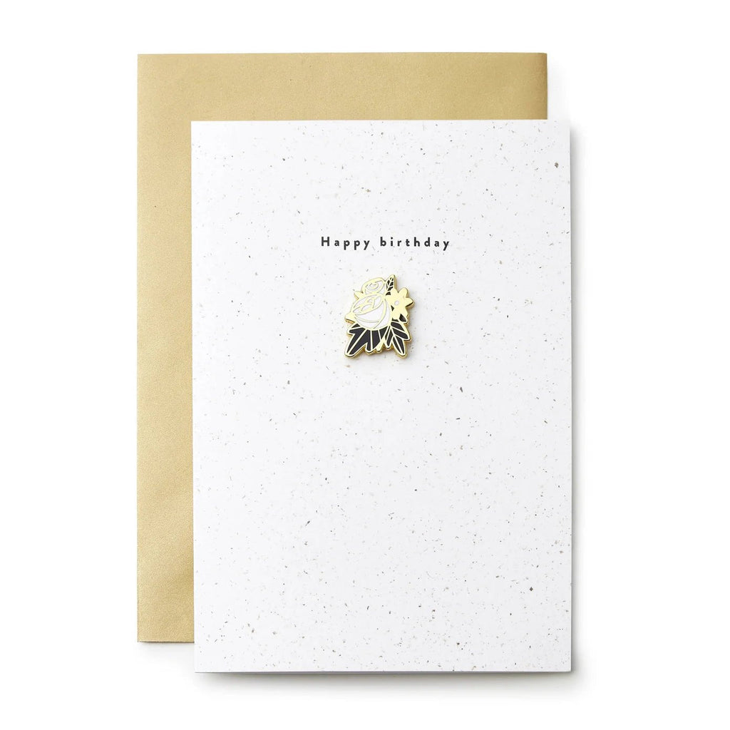 What better way to say Happy Birthday than with a greeting card and a bunch of flowers (in enamel pin form)! The birthday greeting card features a beautiful gold enamel pin in the shape of a bunch of flowers.